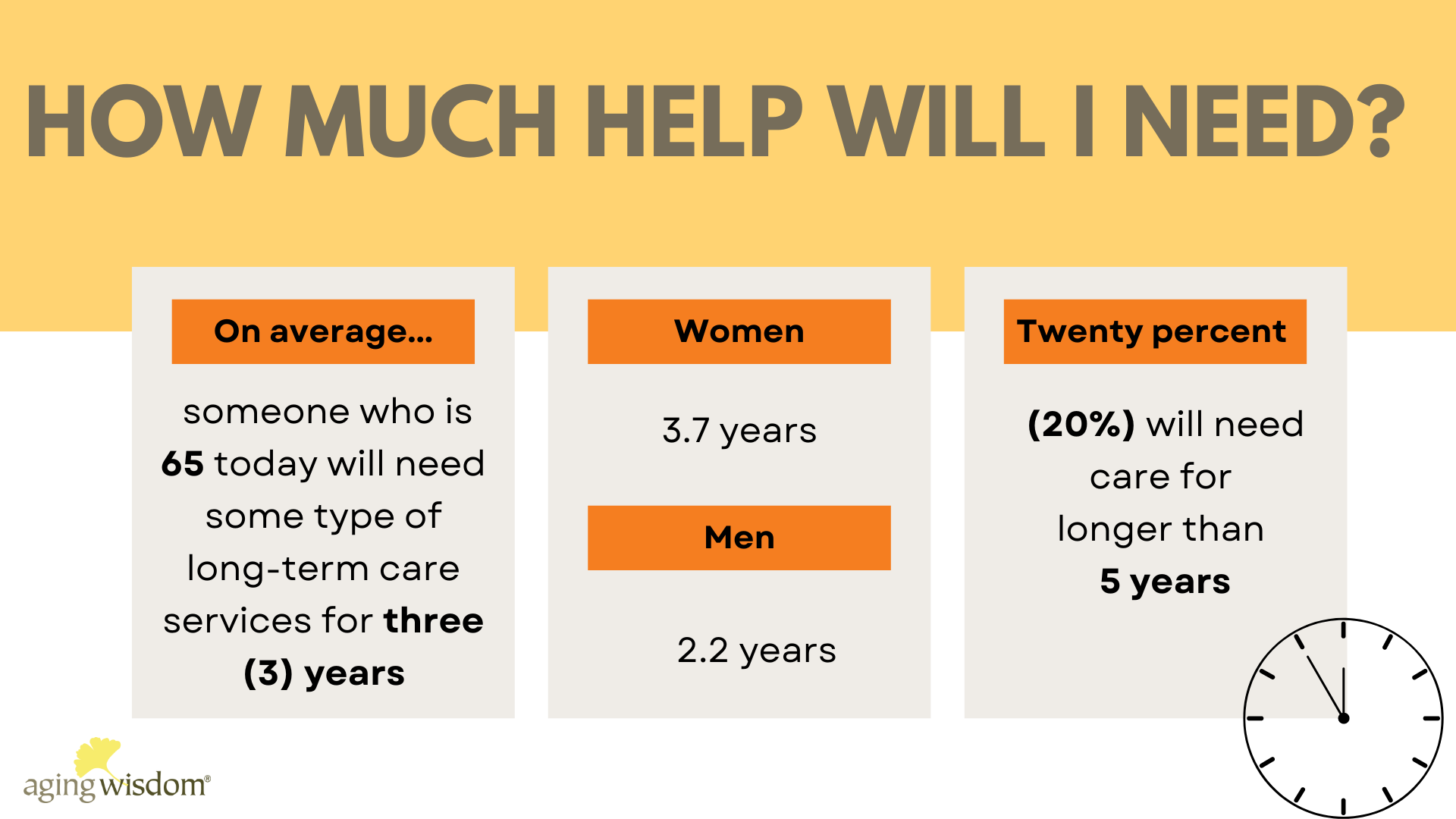 Women tend to live a little longer, and that number is 3.7 years. For men it is a little less at 2.2 years. And 20% of us will need care for longer than five years.